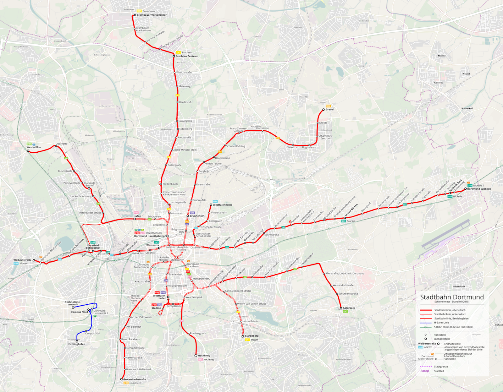 Unlike Leeds, Dortmund has an eight-line, 47-mile Stadtbahn network, essentially an underground tram system, with trains running every ten minutes. The city is also part of the wider Rhine–Ruhr S-Bahn network, a faster commuter rail system with four lines and about 25 miles of track running through the city.