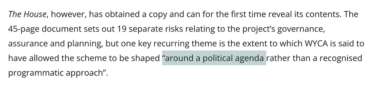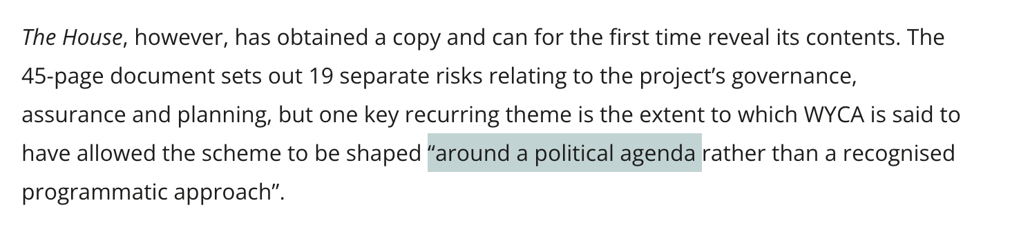 But governance also plays a major role. The decisions, and the funding, for what happens in Leeds do not primarily come from Leeds or even the wider West Yorkshire region. Two years after the local Mayor was elected on a promise of building a tram the government is still ‘assessing the business case’ while writing reports about how maybe it should be a bus instead.